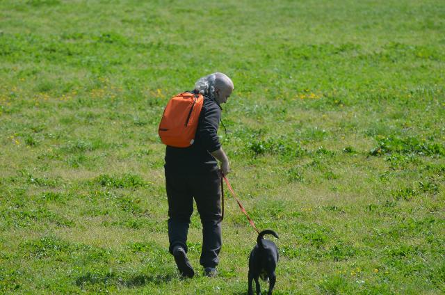 Hanno iniziato con una passeggiata in cui Macchia era libera di annusare e rotolarsi nell'erba mentre Stefano si dedicava ad andature di marcia per stimolare l'apparato cardio-circolatorio e a posizioni statiche per il tono-trofismo della muscolatura degli arti inferiori.