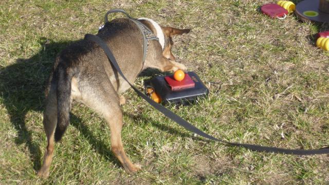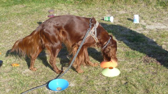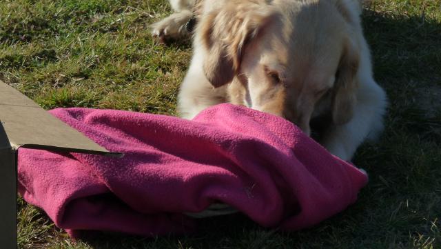 Nella stazione 1 – giochi di ricerca i cani hanno messo alla prova le potenzialità del loro naso attraverso la ricerca di bocconcini o giocattoli nascosti sotto coperte o all'interno di scatole di cartone, primo passo per l'avviamento alla ricerca di superficie.