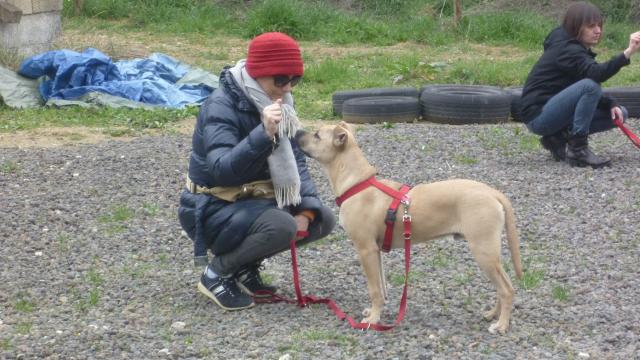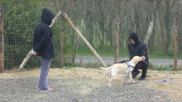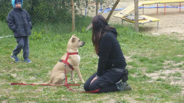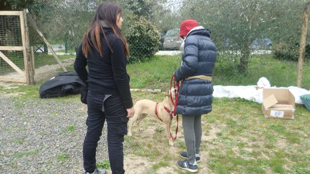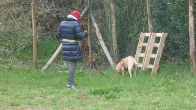 Dopo una breve introduzione sulla gestione al guinzaglio e qualche consiglio generale, ci siamo subito messi al lavoro. Il primo esercizio consiste nel bloccare il cane quando tira al guinzaglio e riprendere a camminare soltanto quando è lui a interrompere la tensione. La seconda esercitazione è sui cambi di direzione, si tratta di mettere insieme un po' delle nozioni e delle abilità apprese poco prima e nelle lezioni precedenti: l'utilizzo dello “schiocco”, del luring e delle direzioni del corpo nell'uso del linguaggio non verbale.