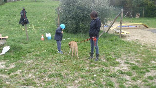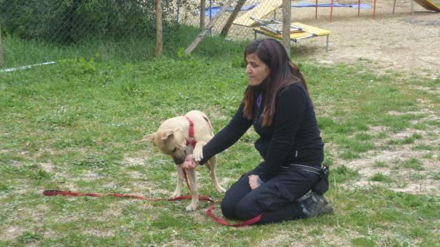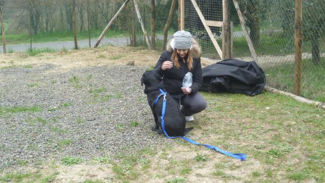 Macchia entra nel campo senza prestare molta attenzione ai cuccioli, ma una cosa la spiega a tutti da subito: non sono qua per giocare con voi!! Rocco e Blu provano diverse volte ad avvicinarla in modo abbastanza irruento, lei non gradisce e lo dimostra con l’abbaio, la sua postura e il modo in cui occupa lo spazio attorno a sé.