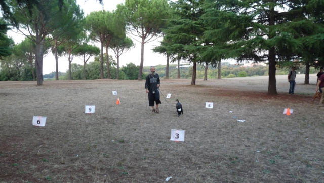 Nella prima parte i binomi uomo-cane si sono cimentati in un percorso a tappe da svolgere insieme, con il guinzaglio sempre lasco e, possibilmente, senza l'utilizzo di bocconcini come stimolo per il cane. Il percorso prevedeva: partenza veloce verso il primo segnale, dove il cane doveva sedersi prima di essere condotto lentamente, girando a sinistra, verso il secondo segnale e lì il conduttore chiedeva un “terra”. Poi il binomio si dirigeva verso destra per raggiungere il terzo segnale realizzando due volte lo “stop&go” lungo il percorso. Al segnale il cane doveva rimanere in “resta” finchè il conduttore non arrivava al quarto birillo, prima di tornare a prenderlo per dirigersi insieme verso un tragitto a slalom.