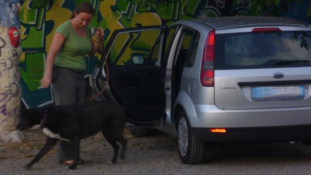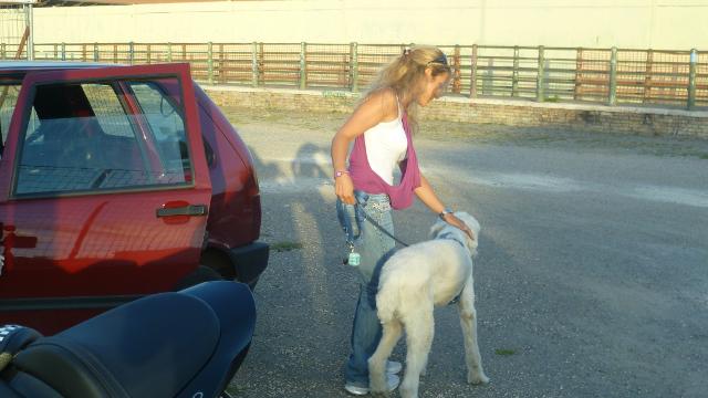Punto di approdo di questa passeggiata è stato il parcheggio per effettuare la prova di discesa dall’automobile (prova n°8). Era la prima volta che affrontavamo questa prova ma tutti i cani conoscevano bene il resta ed avevano già sperimentato la gestione dei varchi con la porta di casa, perciò si trattava semplicemente di mettere insieme competenze ben acquisite. Tutti i binomi hanno ripetuto la prova due volte per perfezionare la fase finale: quando il cane ottiene il permesso di scendere dall’auto deve rimanere ancora in attenzione sul conduttore e mantenersi nelle sue vicinanze in modo da non correre il rischio di andare in mezzo alla strada o di intralciare i passanti.
